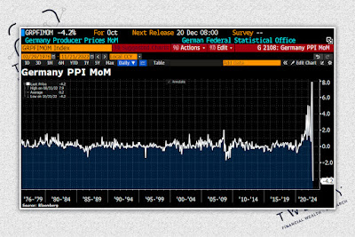 Picco di inflazione in un grafico. I prezzi alla produzione tedeschi sono crollati del 4,2% su base mensile a ottobre. E il più grande calo mensile nella storia del PPI (fonte Bloomberg)