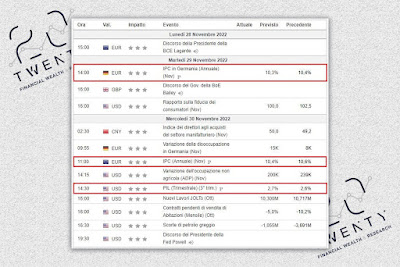 Gli appuntamenti macro a cavallo tra Novembre e Dicembre sono estremamente intensi. Iniziamo da oggi pomeriggio con un discorso della presidente Lagarde alle 15:00, parole che hanno sempre un peso sui mercati finanziari. Il resto della giornata scivolerà senza particolari notizie ma con il ritorno dei volumi a Wall Street dopo il lungo weekend del giorno del Ringraziamento. Martedì 29 Novembre sarà il giorno dell’indice dei prezzi al consumo in Germania: il dato è atteso al rialzo ma siamo stabilmente sopra le due cifre. A mio parere c’è poco da festeggiare. Il pomeriggio il discorso di Bailey, governatore della Bank of England e il rapporto sulla fiducia dei consumatori oltre oceano. Passiamo al Mercoledì con l’IPC questa volta nell’Eurozona, anche questo atteso al ribasso da 10,6% precedente al 10,4% previsto. Il pomeriggio una valanga di dati dagli Stati Uniti: PIL, vendita di abitazioni, scorte di petrolio e in chiusura di serata un discorso del presidente della Federal Reserve Powell.